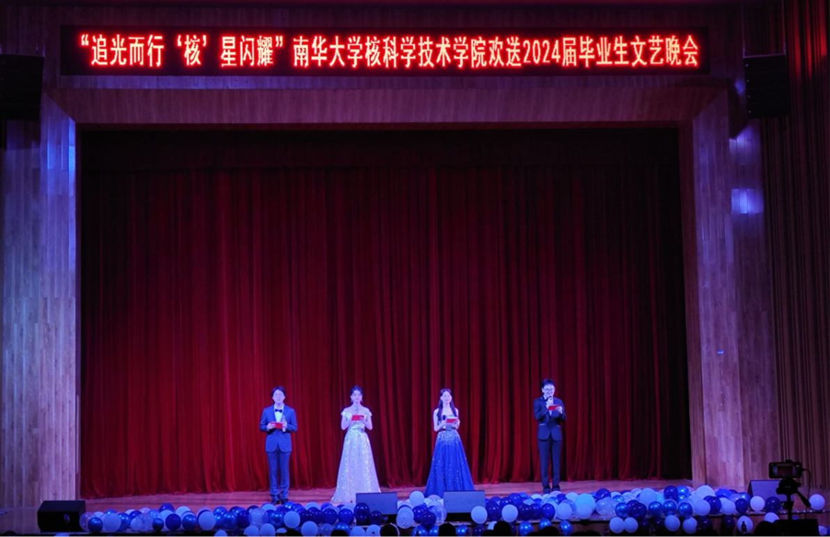 晚会伊始,郑波发表致辞。郑波对24届毕业生们表达了美好的祝愿,介绍了近年来学院在全体师生共同努力下取得的成就,回忆同学们的在校点点滴滴滴,寄语广大学子继续发扬“两弹一星”精神、核工业精神、新时代核工业精神、南华精神,以更加饱满坚定的信念与热情迎接人生的新篇章。