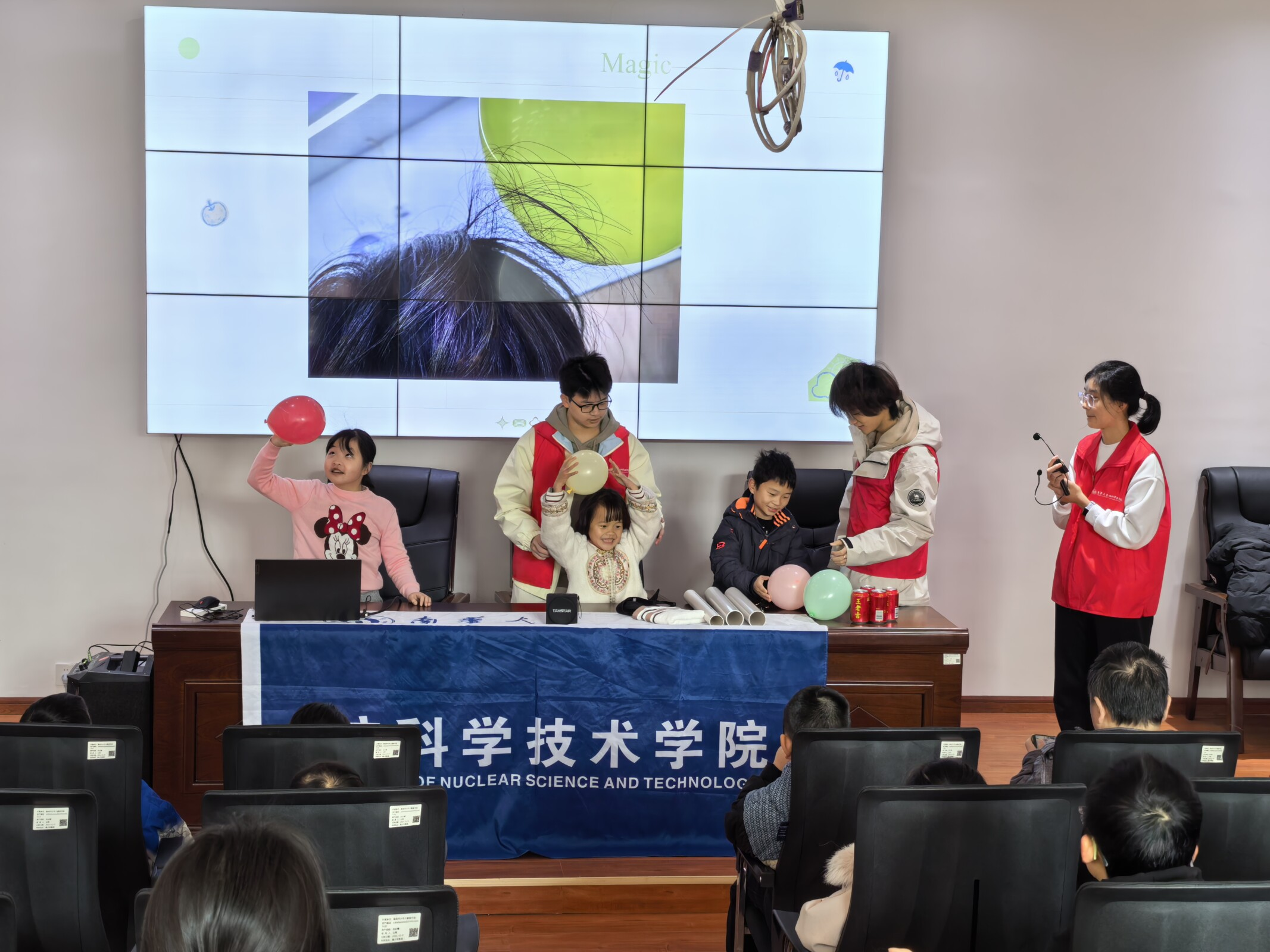 在“魔法原理大揭秘”环节,志愿者用生动比喻揭开静电的科学面纱:“每个物体里都住着‘电子小精灵’和‘质子小卫士’”通过气球吸引碎纸片等直观演示,孩子们明白了摩擦起电、静电吸引与排斥的原理,在互动中轻松掌握科学知识。
