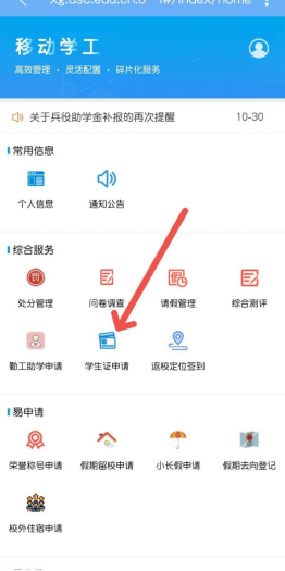打开手机易班的南华学工进入学生证申请