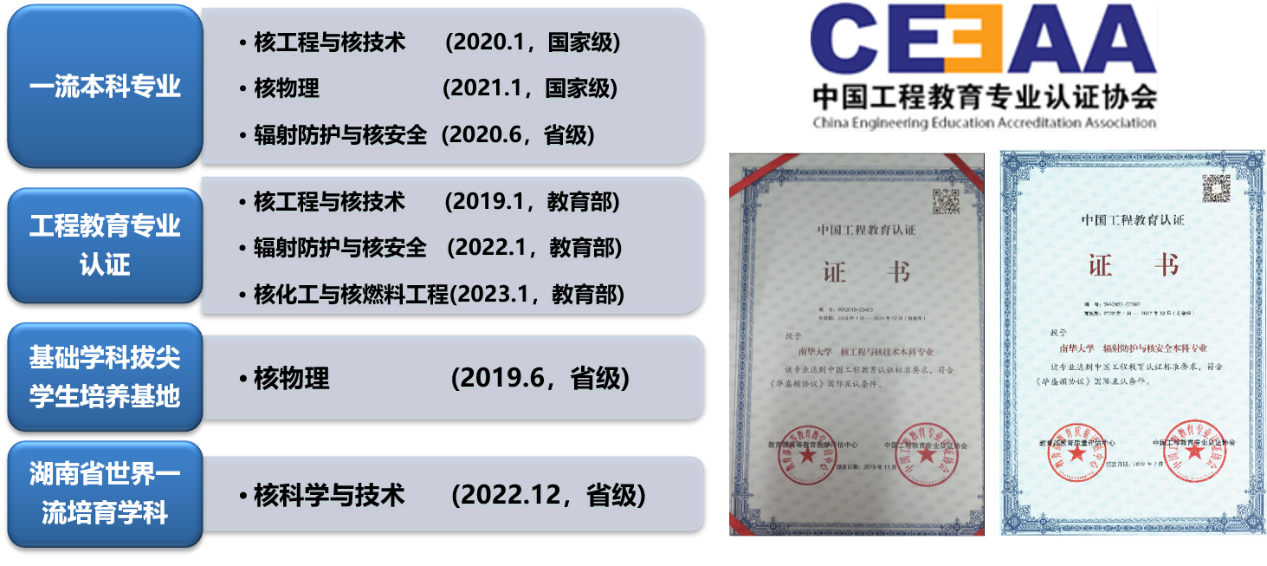 学院现有核工程与核技术、辐射防护与核安全、核化工与核燃料工程和核物理四个本科专业。近年来持续推动一流本科专业建设,其中核工程与核技术专业是首批国家一流本科专业、国家一类特色专业、国家管理专业和湖南省优秀重点专业,同时被教育部列入卓越工程师教育培养计划和“十二五”专业综合改革试点;辐射防护与核安全是湖南省一流本科专业;核物理专业是国家一流本科专业,入选湖南省首批基础学科拔尖学生培养基地。学院积极推动工程教育专业认证,坚持“学生中心、产出导向、持续改进”的认证理念,以评促进、以评促改、以评促强,目前核工程与核技术、辐射防护与核安全、核化工与核燃料工程三个专业均已通过了教育部工程教育专业认证。
