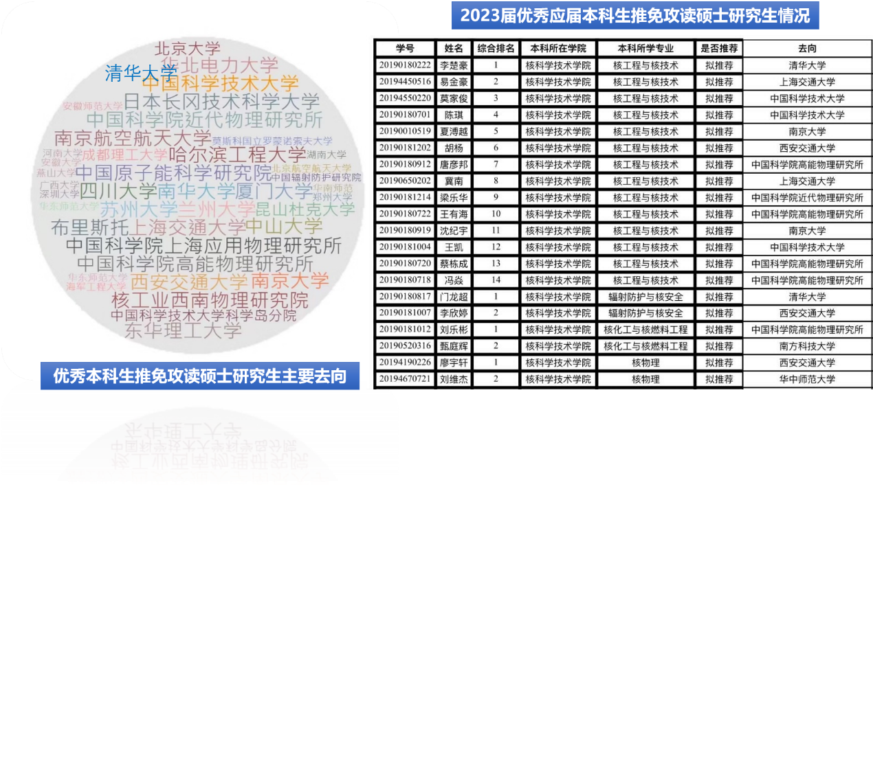 学院积极支持和鼓励优秀本科生参加推免攻读硕士研究生,为做好学院优秀应届本科毕业生免试攻读硕士学位研究生遴选工作,学院根据学校相关文件成立了遴选工作领导小组和工作小组,详细制定了《遴选工作方案及实施细则》,重点考察学生的学习成绩和科研创新能力。建立了多元评价体系,科学合理地制定推免生选拔标准,考察学的学业、能力、品行等方面表现。学院每年约有20个推免指标,被推免学校主要包括清华大学、中国科学技术大学、上海交通大学、西安交通大学、南京大学、北京航空航天大学、南京航空航天大学、中山大学、复旦大学、南方科技大学等国内双一流大学,以及包括中科院高能物理研究所、中科院兰州近代物理研究所、中科院上海应用物理研究所等知名研究院所。