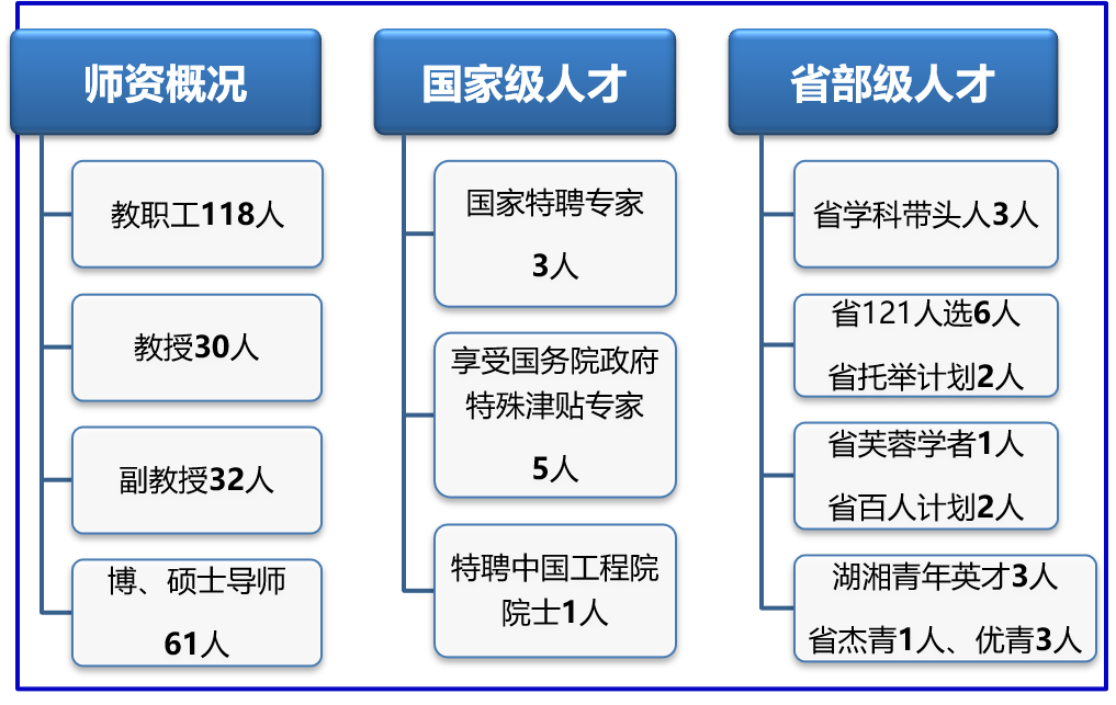 学院积极推动“人才强院”战略,现有教职工118人,其中教授31人,副教授32人,博士生导师、硕士生导师63人。拥有国家特聘专家2人、国家特聘青年专家1人,享受国务院政府特殊津贴专家5人,湖南省“121”人才5人,特聘中国工程院院士1人,湖南省百人计划教授2人,湖南省学科带头人4人,湖南省科技人才托举计划2人、湖湘青年英才3人、湖南省荷尖人才1人,湖南省杰青1人、优青3人。学院拥有“数字核能与智能设计”湖南省科技领军人才创新团队,“气载放射性计量、测量与防护”,“先进反应堆技术”两个湖南省自然科学基金研究创新群体,“放射性测量与防护技术”“先进反应堆技术”两个湖南省高校科技创新团队,“核科学与技术科研团队”荣获“全国工人先锋号”光荣称号。
