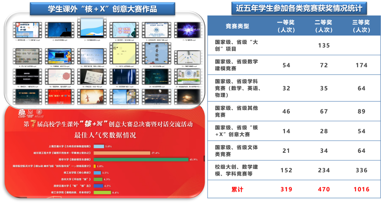 学院以学术型人才培养为目标牵引,积极培养本科生科研创新能力,倡导成果导向模式,推进教学和科研相融合,让学生既能适应经济和社会发展工作所需,又具有超强创新能力。为培养学生创新能力和科研兴趣,学院成立了“核研社”、“双创部”等科教创新团体,开展“核科学与技术学术创新论坛”“学术经典师生共读”等师生共同参与的特色学术活动互动交流,成立了六个本科生科研兴趣小组,吸引、指导本科生广泛参加相关学科竞赛、创新创业竞赛、撰写学术论文、申请发明专利等。近五年来,学院本科生获批国家级及省级大创项目135项、获批各类竞赛一等奖319人次、二等奖470人次、三等奖1016人次。在2022年学院参与承办的全国及湖南省“核+X”创意大赛中,获全国“核+X”创意大赛二等奖1项、三等奖2项、最佳人气奖1项,湖南省“核+X”创意大赛一等奖3项、二等奖6项、三等奖21项。