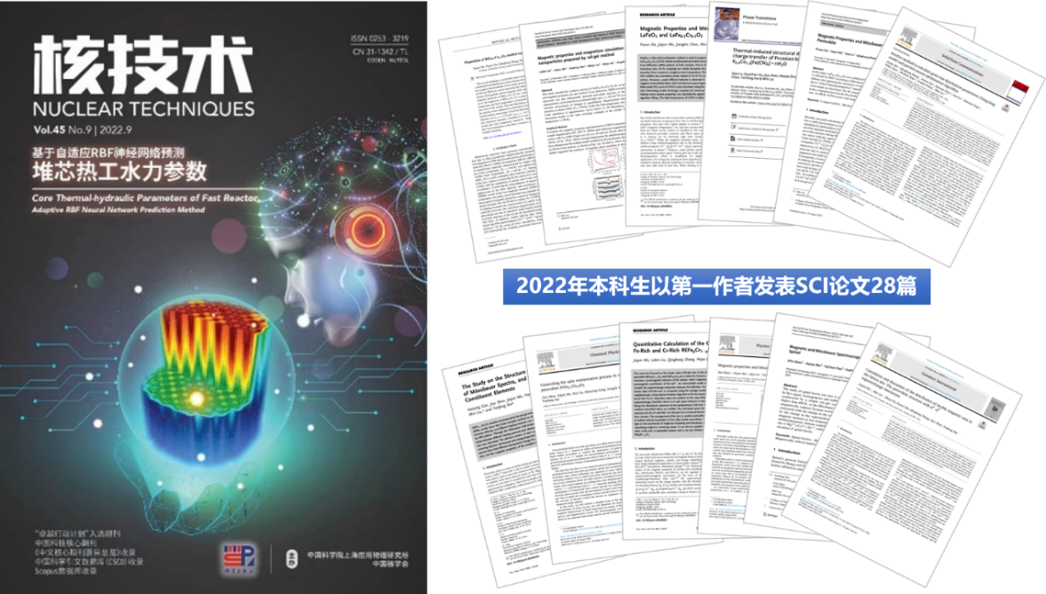 为了夯实学术创新人才培养,学院积极推动本科生进平台、进课题、进项目,以科研项目驱动本科生创新能力培养,让越来越多本科生参与到科研活动中,有效提升了学院本科生的科研素养和创新能力。近五年来,学院本科生以第一作者发表SCI/EI期刊论文105篇,发表核心期刊论文26篇,卓越期刊论文18篇。其中,2022年学院本科生以第一作者发表SCI论文28篇、EI论文6篇、卓越期刊论文8篇。其中,2019级本科生冀南以第一作者在中国科技卓越期刊《核技术》上发表题为《基于自适应RBF神经网络预测堆芯热工水力参数》研究成果,入选2022年第9期封面文章,并获评2022年度最美封面。