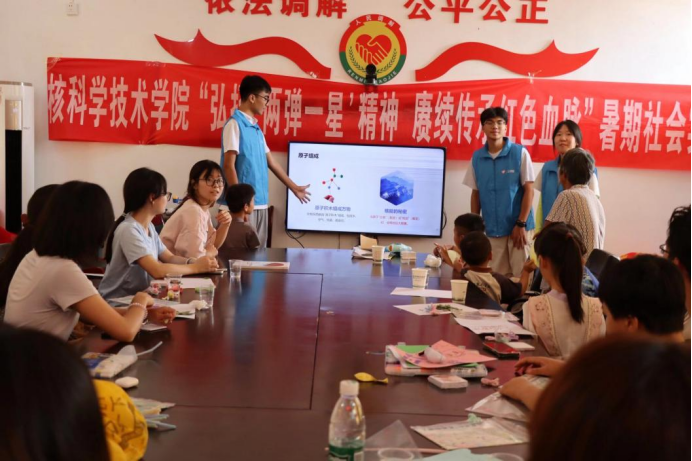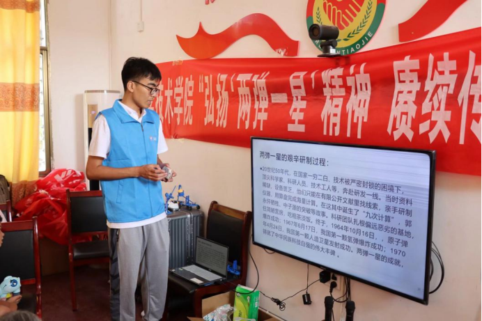7月8日上午,伟德国际victor1946“两弹一星”精神研究会志愿服务团联合伟德国际1949“核韵青春,志愿同心”服务团、进安仁县永乐江镇长潭村,开展“两弹一星”精神宣讲与核科普活动。